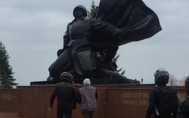 Мотопробег стартовал с площади "АРТ - Квадрат". Дальше колонна двинулась к Парку Победы, где по традиции байкеры возложили цветы к памятнику Миннигали Губайдуллину и Александру Матросову. Монумент в память о павших солдатах в годы Великой Отечественной войны (двойной памятник Героям Советского Союза) был открыт в 1980 году. Это архитектурное сооружение высотой в 25 метров с бронзовыми скульптурными портретами А. Матросова и М. Губайдуллина, над которым возвышается изображение "Золотой Звезды". А у подножья расположена фигура солдата, за спиной которого взлетает плащ-палатка, что символизирует огонь войны. Перед памятником расположен мемориал Вечного огня.
