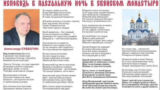 На четвертой полосе газета публикует Молитву ветерана брянской политики Александра Сергеевича Субботина "Исповедь в Пасхальную ночь в Свенском монастыре".