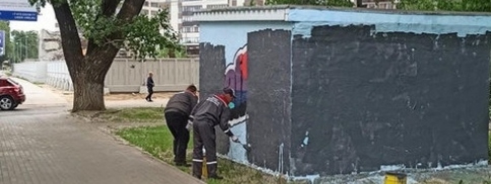 Коммунальщики закрасили две работы художников Михаила Кузьменко, Владимира Абиха и GOODWOLFSKIN, которые они нанесли на трансформаторную будку на улице Депутатской в Воронеже.