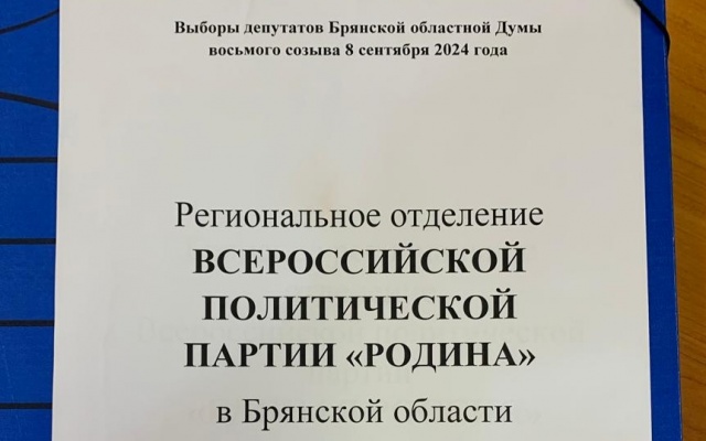 28 июня 2024 года региональное отделение партии "РОДИНА" в Брянской области представило в Избирательную комиссию региона документы на регистрацию единого списка кандидатов в депутаты Брянской областной Думы восьмого созыва. Брянская "РОДИНА" после открытия специального избирательного счета первой из семи партий, выдвинувших кандидатов на выборах депутатов облдумы, сдала документы на регистрацию.