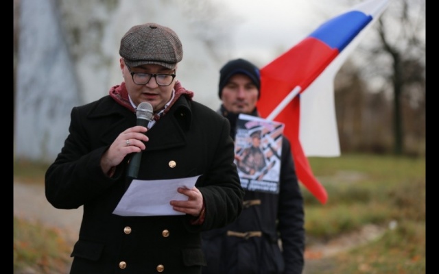 Участники мероприятия подошли к подножию памятника с государственными флагами России и партии "РОДИНА". Ведущий клуба "Родина на Неве" Дмитрий Жвания выступил со вступительной речью: