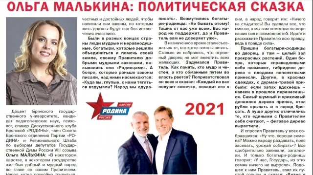 На второй полосе публикуется "Политическая сказка" и "Мысли избирателя вслух" Ольги Малькиной - доцента Брянского государственного университета, кандидата педагогических наук, психолога, спикера Дискуссионного клуба Брянской "РОДИНЫ", члена Совета Брянского регионального отделения партии "РОДИНА" и Регионального Штаба по выборам депутатов Государственной Думы России VIII созыва.