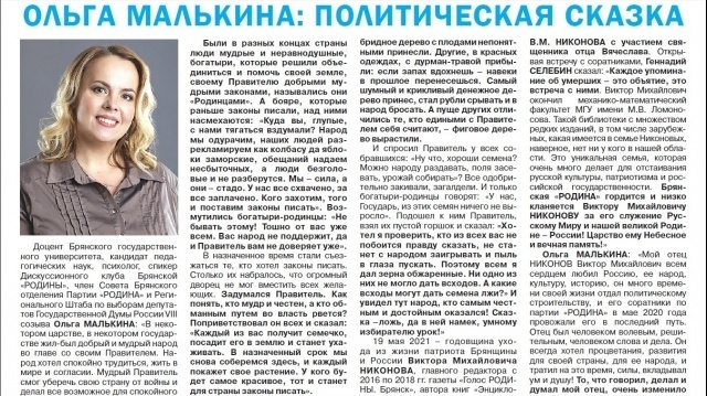 На второй полосе публикуется "Политическая сказка" Ольги Малькиной - доцента Брянского государственного университета, кандидата педагогических наук, психолога, спикера Дискуссионного клуба Брянской "РОДИНЫ", члена Совета регионального отделения и регионального Штаба по выборам депутатов Государственной Думы России VIII созыва.