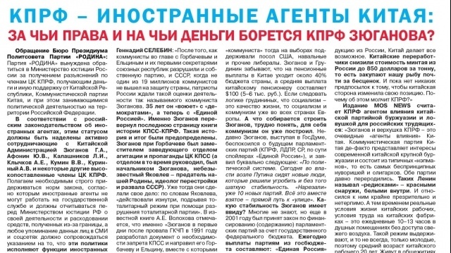 Партия "РОДИНА" обратилась в Минюст России о проверке деятельности членов ЦК КПРФ на предмет предательства интересов страны. "РОДИНА" считает верхушку КПРФ очевидными агентами влияния Китая. А их деятельность - целиком подпадающей под положения законодательства РФ об иностранных агентах. Закон запрещает заниматься в России политической деятельностью, используя деньги из-за границы.