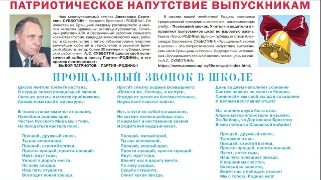 В школах нашей необъятной Родины состоялся традиционный праздник школьников, заканчивающих учебу - Последний звонок. Учителя и родители отправляют выпускников школ во взрослую жизнь. Газета "Голос РОДИНЫ. Брянск" публикует стихи Александра Сергеевича Субботина "Прощальный звонок в школе" - патриотическое напутствие выпускникам школ Брянщины и России. Видеоролики исполнения "Прощального звонка в школе" размещены на сайте Александра Субботина.