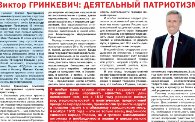 На третьей полосе – статья депутата Брянской областной Думы, эксперта Изборского клуба Виктора Гринкевича "Деятельный патриотизм". Недавно Виктор Гринкевич принял участие в круглом столе Изборского клуба (Председатель Изборского клуба соратник ПАРТИИ «РОДИНА» Александр Проханов) «В поисках русской мечты и образ будущего». Вел круглый стол первый заместитель Председателя Изборского клуба, наш земляк Олег Розанов. В своих докладах и выступлениях тему «русской мечты» раскрывали философы, историки, экономисты, политики, военные и общественные деятели - постоянные члены Изборского клуба, в том числе академик РАН, советник Президента РФ Сергей Глазьеви российский экономист, председатель Совета Партии «РОДИНА» по экономике и бизнесу Михаил Хазин. В заседании круглого стола принимал участие начальник Управления Президента РФ по общественным проектам Сергей Новиков.
