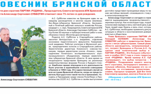 В материале «Ровесник Брянской области» - поздравление с юбилеем соратника партии "РОДИНА", экс-вице-губернатора, Председателя Совета ветеранов АПК Брянской области, Заслуженного работника сельского хозяйства России, кандидата наук Александра Субботина.
