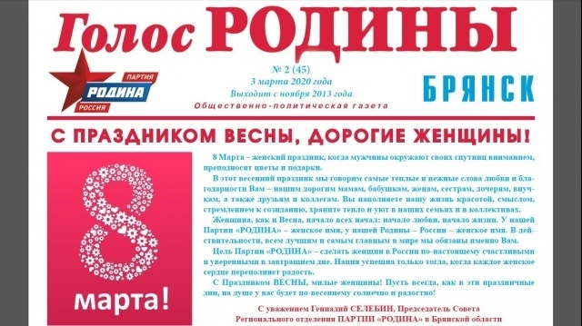 Открывает газету поздравление председателя регионального отделения партии "РОДИНА" Геннадия Селебина с Праздником Весны 8 Марта женщин Брянщины.