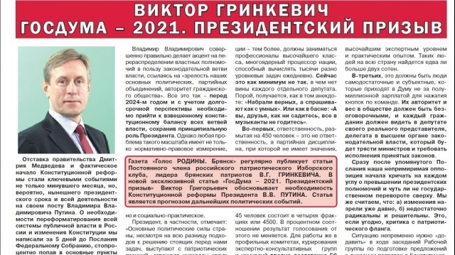 Всероссийское голосование по поправкам в Основной закон страны пройдет 22 апреля. О необходимости Конституционной реформы Президента РФ Владимира Путина в газете на второй полосе публикуется заслуживающая особого внимания читателей статья Постоянного члена российского патриотического экспертного Изборского клуба, лидера брянских патриотов Виктора Гринкевича "Госдума - 2021. Президентский призыв".